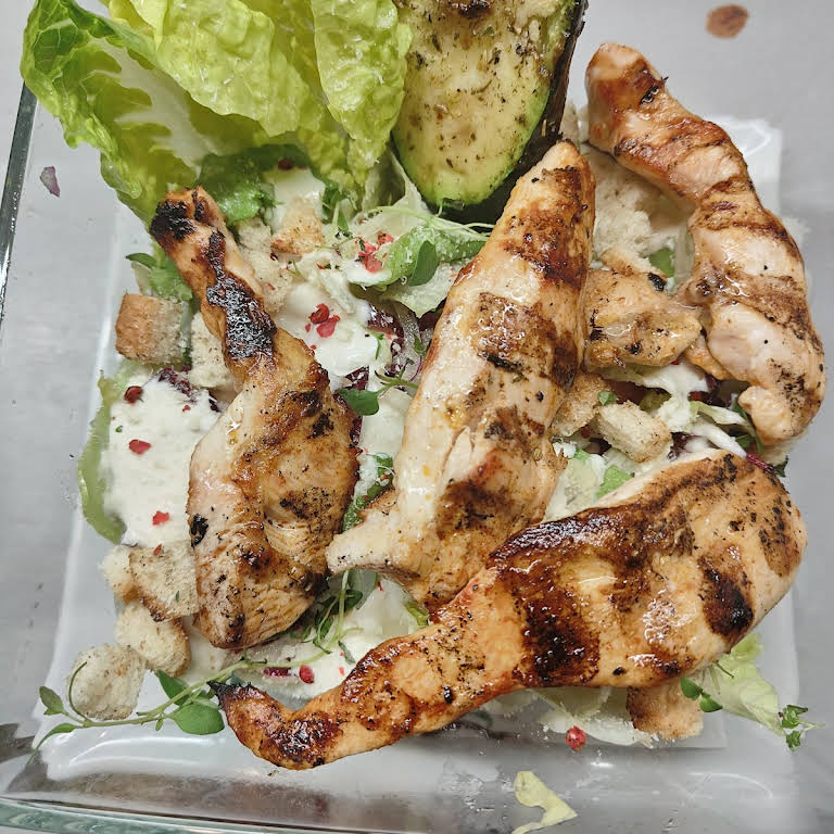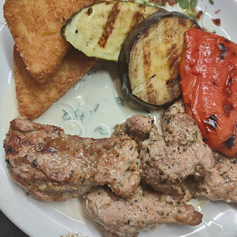 PLN 35.00Sałata lodowa mix z oliwą z oliwek, pomidorem i czerwoną cebulą, grillowana cukinia, grillowany bekon, prażona cebulka, 2 sosy gyros - sambalKARKÓWKA GRILLOWANA + frytki lub ziemniaki pieczone
